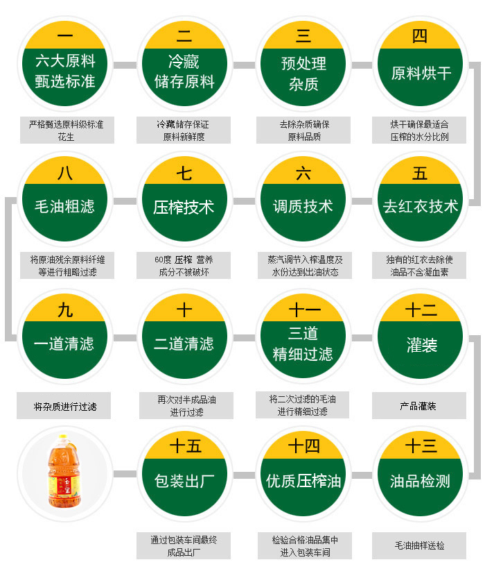 玉皇將花生炒熟再進(jìn)行壓榨,十五道嚴(yán)格把關(guān)的壓榨工藝,成就玉皇活性好油。